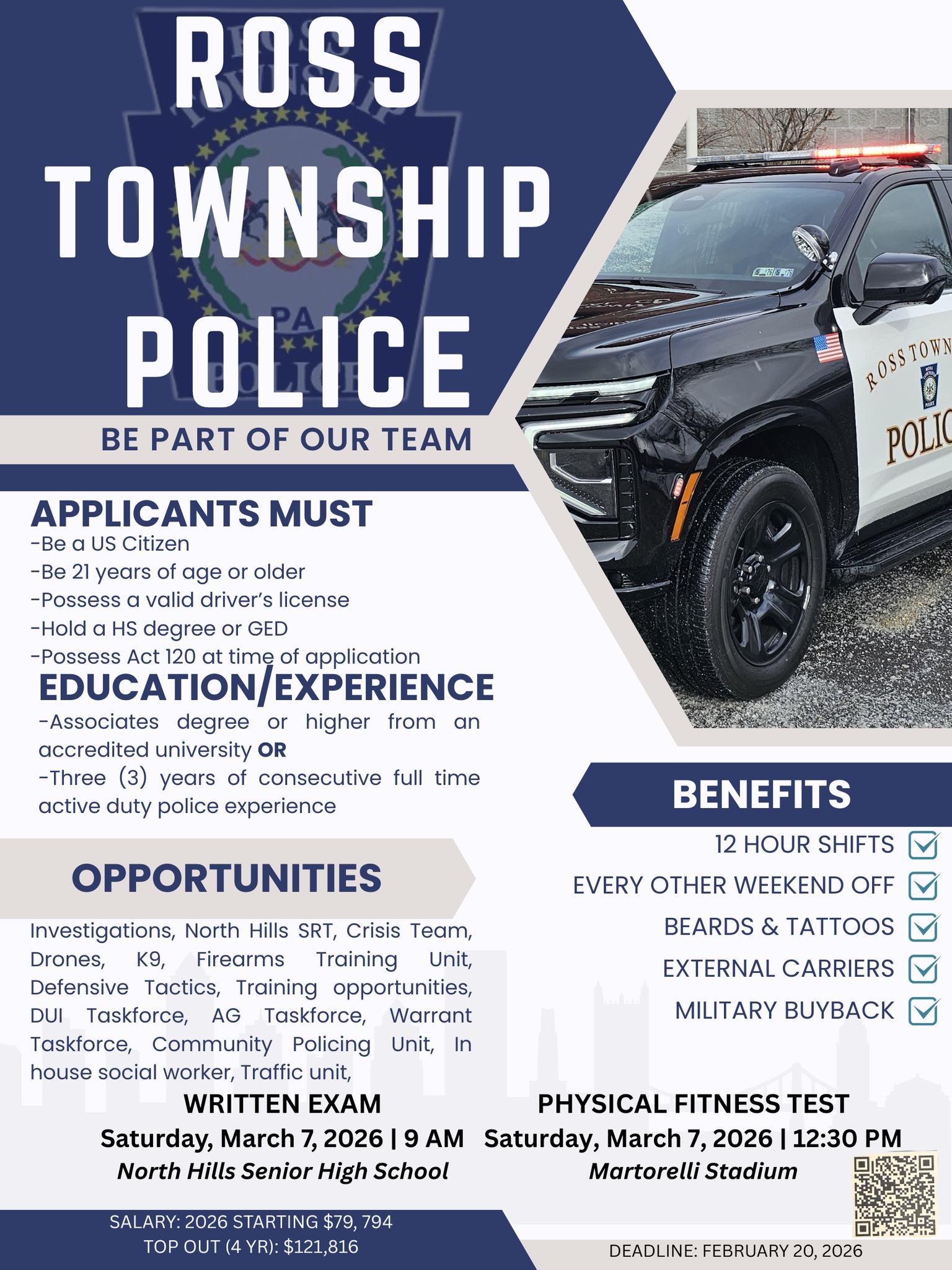 Volunteers Needed! Get involved! Open seats are available on the Ross Township's Athletic Advisory Board, Vacancy Board, Building Code Appeals Board, and Girty's Run Joint Sewer Authority. Learn more and apply today!
